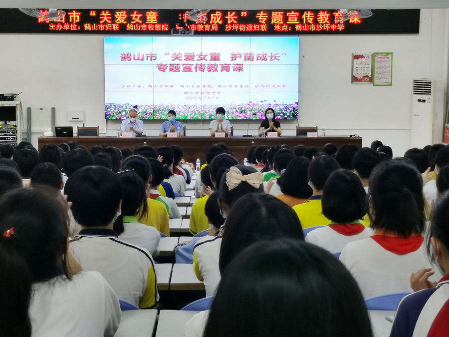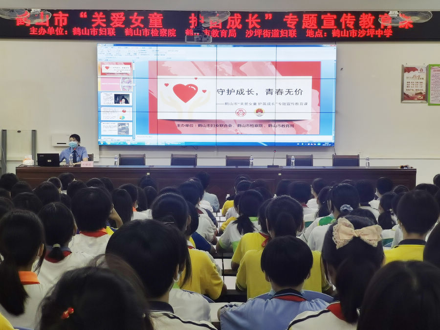 9月7日,鹤山市妇联、市检察院、市教育局联合到沙坪中学开展鹤山市“关爱女童,护苗成长”专题宣传教育活动,我院第五检察部派员参加。我院代表通过图片展览、PPT展示等为学校的女学生讲授了“守护成长、青春无价”主题法治课,以案例和数据警示学生们要加强对性侵害和自我保护的认知,提高预防警惕意识。